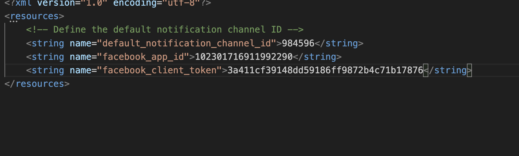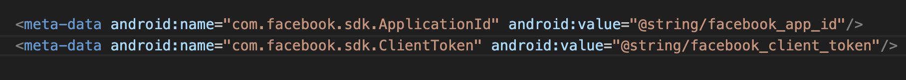 Add your Facebook App ID to the AndroidManifest.xml file located at android/app/src/main/AndroidManifest.xml: